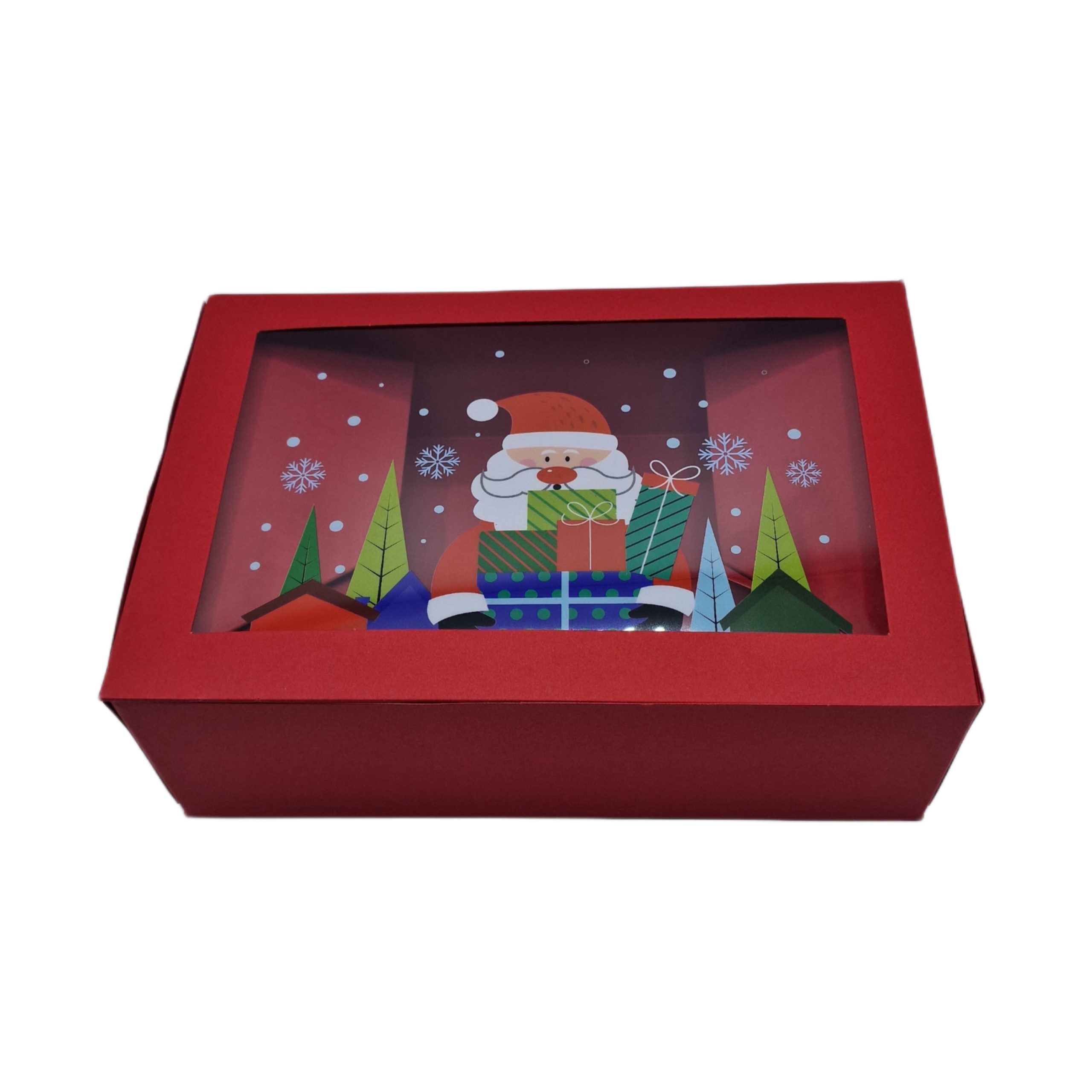 Ambalează darurile de sărbători cu stil! Această cutie din carton roșu este decorată cu un model festiv de Crăciun, perfect pentru a aduce bucurie sub brad. Capacul are o fereastră transparentă ce permite vizualizarea conținutului, fiind ideală pentru cadouri, bomboane ,prăjituri, lumânări sau accesorii.